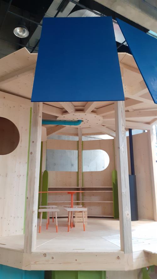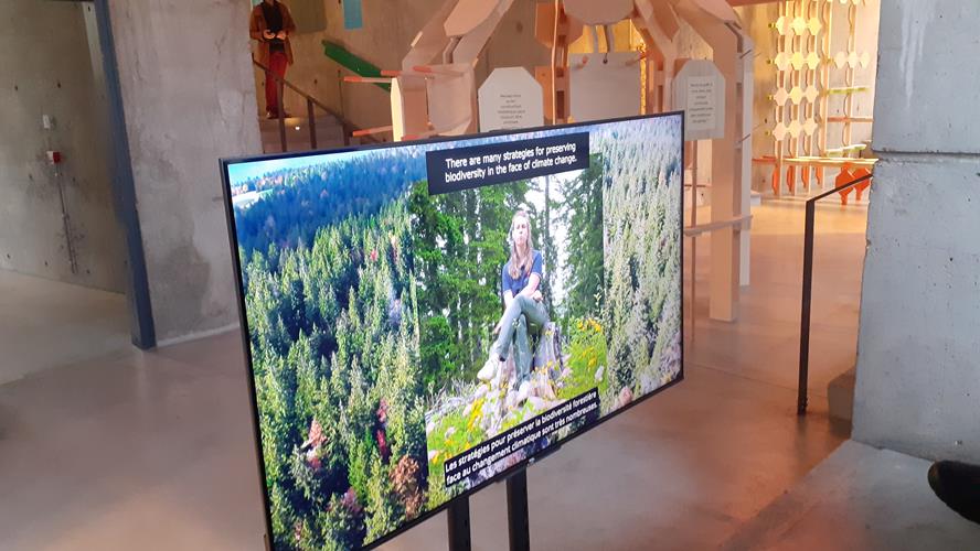 L’installation met en valeur le « bois bleu », issu d’épicéas scolytés fragilisés par le réchauffement climatique.